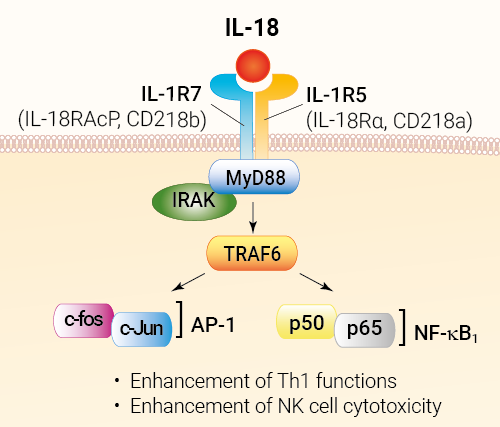 IL-18 mediates its biological effects through the IL-1R5 receptor (also known as IL-18Rα, CD218a) and the IL-1R7 accessory protein (also known as IL-18RAcP, IL-18β, CD218b) [1, 2, 4]. Upon ligand binding, IL-1Rs dimerize through their Toll/interleukin-1 resistance (TIR) domains to recruit the MyD88 adaptor protein, which then couples to IL-1R-associated kinases (IRAKs) and tumor necrosis factor receptor-associated factor 6 (TRAF6). This leads to the activation of key transcription factors, including NF-κB, AP-1, and IRFs [1-4].