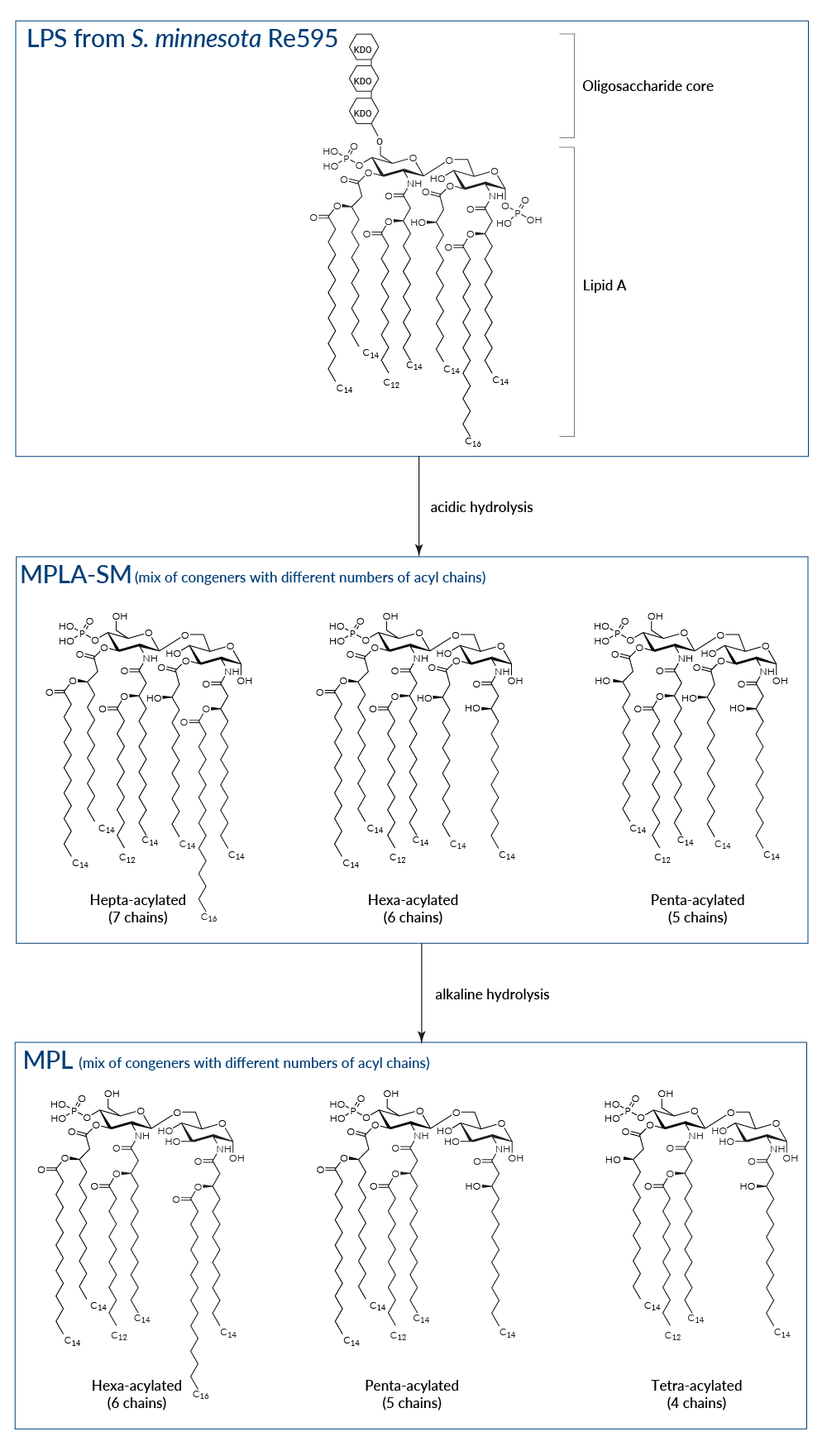 An additional base hydrolysis of MPLA removes one specific fatty acid and generates 3-O-deacylated monophosphoryl lipid A (also known as MPL, 3D-MPL, or 3D-MLA). This deacylation step further decreases the compound residual toxicity. MPL® is a clinical grade vaccine adjuvant that is manufactured exclusively by GlaxoSmithKIine [1].