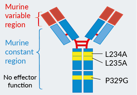 Anti-β-Gal-mIgG2ae3 is expressed and produced in Chinese hamster ovary (CHO) cells, ensuring reliability and lot-to-lot reproducibility. Thereby, common hybridoma-related drawbacks such as the generation of non-relevant mAbs containing aberrant light chains are avoided. Due to the triple mutation LALA-PG, it displays no ADCP (antibody-dependent cell-mediated phagocytosis), no ADCC (antibody-dependent cell-mediated cytotoxicity) and no CDC (complement-dependent cytotoxicity) effector functions.