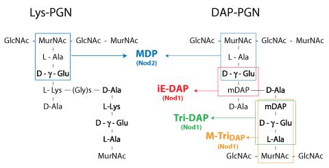 NOD1 senses the D-γ-glutamyl-meso-DAP dipeptide (iE-DAP), which is found in PGN of all Gram-negative and certain Gram-positive bacteria [1, 2] whereas NOD2 recognizes the muramyl dipeptide (MDP) structure found in almost all bacteria.