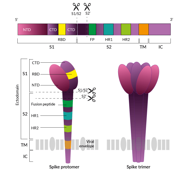 Most of the current knowledge about SARS-CoV-2 S is based on analogies with findings on the previously identified SARS-CoV S. Clove-shaped trimers of Spike proteins form large surface protrusions that give the coronaviruses the appearance of having a crown. Each Spike protomer contains three segments: a large ectodomain, a transmembrane anchor (TM), and a short intracellular tail (IC) [1, 2, 9]. The Spike ectodomain contains three critical elements: